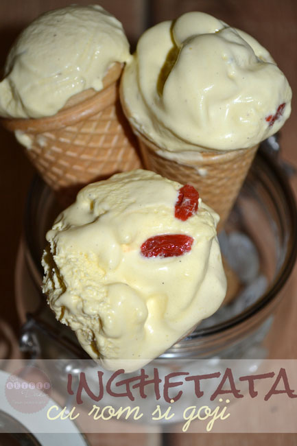 Dacă m-ar întreba cineva care este înghețata mea preferată mi-ar fi tare greu să răspund. Asta pentru că îmi plac mai multe arome și depinde de starea în care sunt. Ce pot însă să spun este că printre preferatele mele se află înghețata cu rom, stafide și nuci. În cazul dietei stafidele și nucile nu sunt permise, dar dacă nu sunteți la dietă atunci înlocuiți goji cu stafide (sau nu neapărat) și adăugați nuci. O să vă placă cu siguranță.