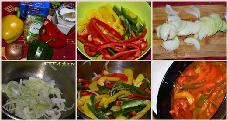 Spălați și curățați ardeii de cotor și sâmburi, iat apoi îi tăiați fâșii de circa 1 cm. Taiați ceapa julien și o ”căliți” puțin într-o oală (eventual puteți folosi o linguriță de ulei de măsline). Adăugați apoi ardeii și usturoiul și puneți 200 ml de apă. Acoperiți cu capacul și lăsați să fiarbă 15 minute. Adăugați pasta și sosul de roșii și mai lăsați la fiert înca 15 minute.