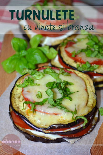 Pentru asamblarea turnulețelor întindem brânza pe fiecare felie de vânătă. Punem o felie de vânătă, una de roșie, frunze de busuioc, vânătă, roșie. Deasupra punem cașcaval ras și așezăm turnulețele pe hârtie de copt în tavă (sau direct în tava de silicon).